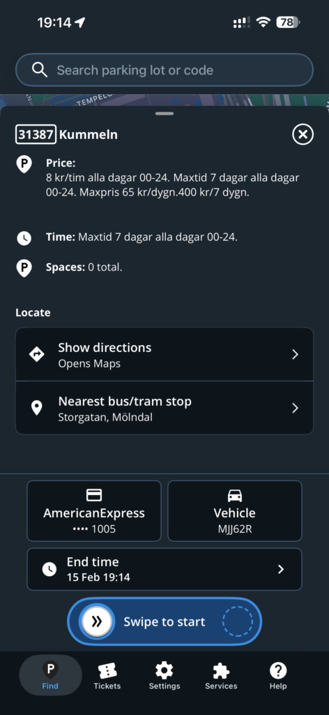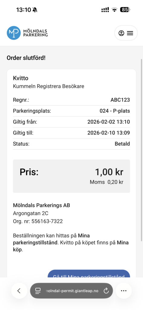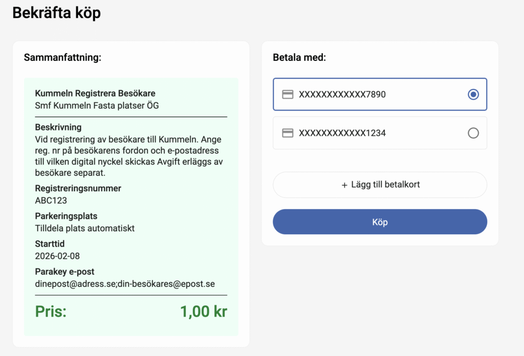 Väljer du att få en plats tilldelad automatiskt ser du vilken parkeringsplats som blev tilldelad efter köpet.
