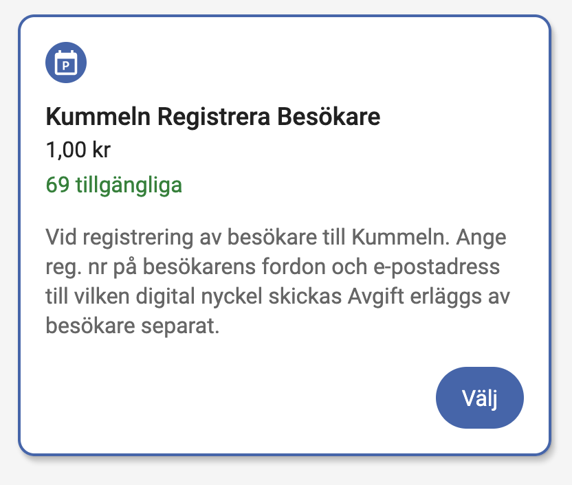 När du valt östra garaget i listan väljer du produkten ”Kummeln Registrera Besökare”. Det är viktigt att detta görs innan infart i p-huset eftersom registreringsnumret läses av vid infart av kamera och igen vid infart i Kummelns inhägnad.