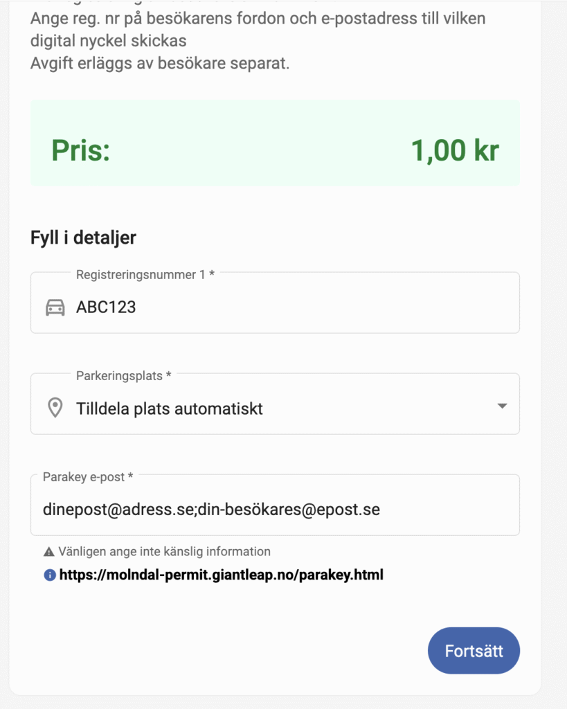 Fyll i registreringsnummer samt e-postadress dit den digitala nyckeln för att öppna porten skickas. Det går att fylla i flera e-postadresser om du själv vill ha en nyckel utöver besökaren. Du som boende kan även öppna porten med hjälp av din tagg. Var noga med att meddela din besökare om vilken plats som ska användas.